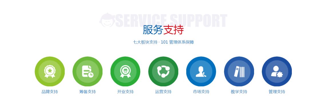 运营支持、市场推广支持、教研输出(教材与教具)、教学教研支持、师培体系支持、课程体系支持及营销指导等等。