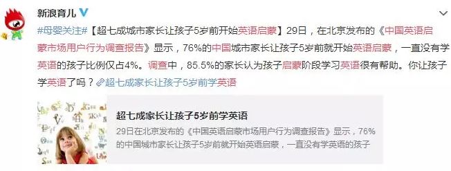 上个月,在北京发布的《中国英语启蒙市场用户行为调查报告》显示,76%的中国城市家长让孩子5岁前就开始英语启蒙,一直没有学英语的孩子比例仅占4%。