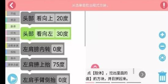 小丹编程实验室以图形编程的形式,将各种功能通过便签式界面展现出来,通过不同模块的衔接,完成对小丹的动作、情绪等方面的操控。